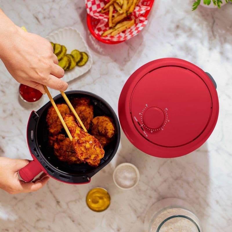 This compact 2.0qt air fryer lets you enjoy all the crispy goodness of deep fried foods without all the oil. Cook up appetizers, meals and snacks for one or two people in a flash. Air frying with little to no oil results in foods that are crispy on the outside and tender on the inside, with up to 80% less fat compared to deep frying. The non-stick basket and pan are easy to clean. With temperatures up to 400°F, this air fryer crisps up chicken wings, fries, vegetables and more with the touch of a button. Plus, it’s small enough to fit on any kitchen counter. Say goodbye to greasy deep fried foods and hello to a healthier, oil-free alternative with this must-have countertop air fryer. HEALTHY COOKING: This air fryer allows you to enjoy your favorite fried foods with up to 75% less fat than traditional deep frying methods. EASY TO USE: With a simple to use digital touchscreen, you can set the temperature from 180°F to 400°F and timer up to 30 minutes. FAST COOKING: The powerful air circulation and rapid hot air technology cook your food up to 50% faster than a conventional oven. 2 QUART CAPACITY: Large 0 quart non-stick basket fits about 1-2 servings of French fries, chicken wings or chicken nuggets at a time.