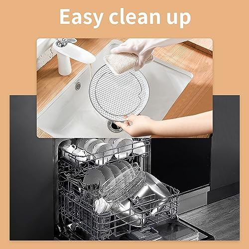 Tips: Before using apply some oil to the surface of rack to prevent sticking. For hand washing, using warm water and a brush makes it easier to remove stains from the mesh. 【Safe and Quality Material】Made of 304 stainless steel and food-grade silicone, it will not produce harmful substances under high temperature, durable and dishwasher safe. 【Adjustable Height】The tray is 7.8 inches in diameter and 1.9 inches in height with 3 layers stacked. The set also includes 6 silicone heightening feets, which can increase the height of each tray, providing enough space for cooking. 【Efficient and Easy Cooking】 Help you utilise the space in your air fryer efficiently and cook more food at once. The mesh design allows for smooth circulation of hot air, so that food is evenly heated and more crispy. 【Set Includes】The set includes three mesh racks, an oil brush, a rack clamp and six food-grade silicone feet for rack. 【Multipurpose】These stackable racks can be used not only in air fryers, but also in ovens, steamers, and work great as bread baking racks or fruit and vegetable dehydrating racks.