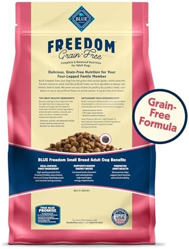 BLUE Freedom Grain-Free Adult Dry Dog Food for Small Breed Dogs is made with chicken as the first ingredient, plus antioxidant-rich fruits and vegetables for truly balanced nutrition. It’s specially formulated for small dogs. That’s why it’s made with increased levels of protein and carbohydrates to support their higher energy needs. What’s more, this small breed dog food supports joint function and overall mobility with Glucosamine. And like all Blue Buffalo dog food recipes, this dog food contains no chicken (or poultry) by-product meals. It’s also free of corn, wheat, and soy. Is Discontinued By Manufacturer : No Product Dimensions : 13.5 x 8 x 4.25 inches; 4.06 Pounds Manufacturer recommended age : 1 month and up Item model number : 800407 Department : dog-dry-food Date First Available : April 10, 2012 Manufacturer : Blue Buffalo Company, Ltd ASIN : B007SWZ7Y2