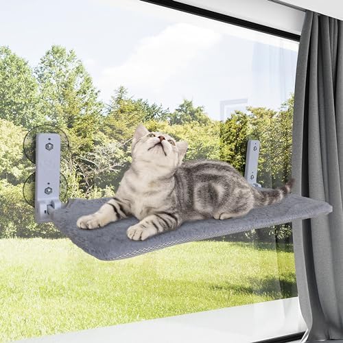 Cat Window Perch Cordless Cat Hammock, Assemble Without Tools in 2 Minutes, with 4 Suction Cups and Sturdy Setal Frame,Foldable Cat Beds for Indoor Cats (Grey)