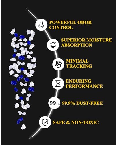 ADVANCED MOISTURE ABSORPTION: Crafted with premium silica gel, crystal cat litter excels at absorbing and solidifying large amounts of liquid, maintaining a consistently dry and clean litter surface for a comfortable pet environment EFFECTIVE ODOR CONTROL: Expertly neutralizing smell, this cat crystal litter ensures a consistently fresh litter box environment. Its rapid absorption technology swiftly captures and locks away odors, keeping your home smelling pleasant LASTING CONVENIENCE: Experience hassle-free maintenance and cost savings with an 8.6lb bag of crystal litter. Its exceptional durability allows it to last up to 6 weeks, reducing the frequency of litter replacement. Enjoy effortless upkeep and long-lasting benefits with cat litter blue crystals MINIMIZING TRACKING: With large pellets and a smooth surface, litter crystals prevent sticking to the cat’s paws, ensuring a cleaner home environment without any paw prints or residue WIDELY LOVED: Designed with a dust-free manufacturing process, unscented crystal cat litter prioritizes the safety and well-being of pets and owners. This gentle silica gel litter ensures the safety of pets and humans alike. Its odorless crystals are also ideal for sensitive noses