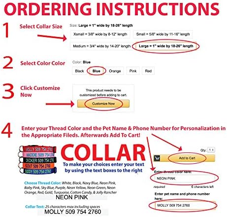 Durably made with comfort in mind. Made of high-quality nylon webbing, a stainless-steel D-ring for tag and leash attachment, and a secure plastic side release buckle for easy one handed quick release. The nylon has smooth, tapered edges for a comfortable fit. (Pack of 1) Available in 5 colors + 14 thread color options = 70 different collar combo options. Available in 4 sizes: Xsmall, Small, Medium, or Large. Xsmall = 3/8 inch wide by 8-12 inches adjustable length; Small = 5/8 inch wide by 11-16 inches adjustable length, Medium = 3/4 inch wide by 14-20 inches adjustable length, and Large = 1inch wide by 18-26 inches adjustable length. To order click customize now where you will select your collar color, thread color, size, and collar text. Please note: In some cases, when sizing the collar down there is a possibility that the adjustable slider could rest over some of the custom embroidery. Collar text is limited to 25 characters max.