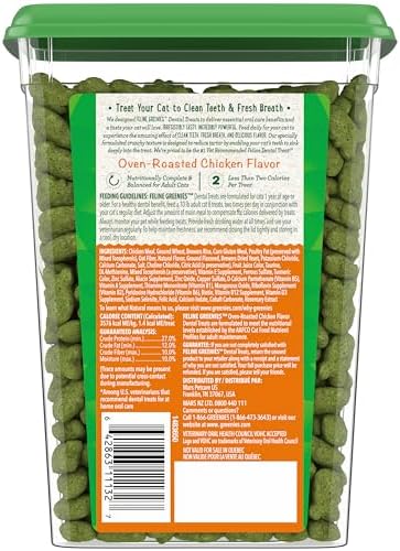 This convenient tub contains 9.75 oz. of FELINE GREENIES Crunchy Dental Treats in Oven Roasted Chicken Flavor Crunchy texture helps clean teeth, reduce tartar buildup, and freshen breath Made with natural ingredients plus added vitamins, minerals, and other nutrients; nutritionally complete and balanced for adult cats This tasty cat treat has no artificial flavors, has no artificial preservatives, and contains less than 2 calories per treat