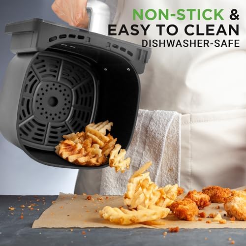 EFFORTLESS CLEANUP – Non-stick surface and removable basket guarantee easy serving and cleaning with this air fry. Dishwasher-safe tray simplifies maintenance. Compact size and make storage and cleaning a snap.
