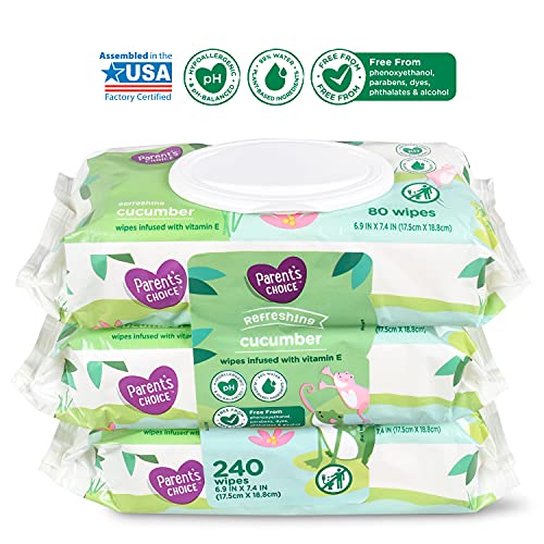 You are getting (1) 240-count package of Parent’s Choice Refreshing Cucumber Scent Baby Wipes Infused with Vitamin E. Package Includes: (3) 80-count packages so you are getting 240 wipes total. Size: Each wipe measures: 6.9 x 7.4 inches (17.5 x 18.8 centimeters). Parent’s Choice Cucumber Scent Baby Wipes are unique, ultra-thick, cloth-like wipes that are as gentle as water, yet extremely strong. Our baby wipes are specially designed to be gentle on your little one’s delicate skin, but effective in wiping away the toughest messes. Each wipe is moistened with a mild cleaning solution and infused with vitamin E that is gentle enough for use on baby’s face and hands. You can feel comfortable knowing that these wipes are pH balanced and hypoallergenic, so you can confidently provide your child with the utmost care. The flip-top container design ensures that each wipe remains moist and fresh when the resealable lid is closed and allows each wipe to come out ready to use on any part of your baby’s delicate skin. Pamper and clean your sweet little one with Parent’s Choice Cucumber Scent Baby Wipes. Features: >>> Hypoallergenic and pH balanced. >>> 99% water and plant-based ingredients. >>> Infused with Vitamin E. >>> Flip top lid keeps in moisture and makes it easy to remove wipes from the package. >>> Free from phenoxyethanol, parabens, dyes, phthalates, and alcohol. >>> Soft, durable, and thick wipes. >>> Color: White. >>> Perfect for babies to children and adults. These wipes can be used by everyone from babies to children and adults. >>> Made in the USA from 90% or more US parts. Factory Certified. >>> Made by Parent’s Choice. Since 1998, Parent’s Choice has been trusted by parents across the country to provide quality, affordable baby products. With a quality guarantee to back up all its baby products, Parent’s Choice takes care of your little one’s needs for less. UPC:681131056168. Do not flush. >>> Satisfaction Guarantee. Order now. Your purchase is backed by Amazon.