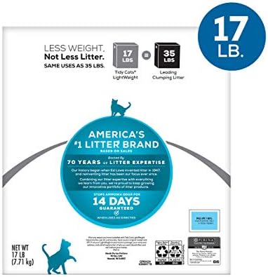 Help keep your home smelling fresh and inviting with Purina Tidy Cats LightWeight Instant Action clumping litter for multiple cats. Weighing half as much as the leading clumping kitty litter formulas and with a low-dust composition, Tidy Cats lightweight litter is easy to carry, pour and store. Tight clumps make it easy to clean your cat litter box, and the bright outdoors scent keeps your kitty litter area smelling fresh and clean. An Ammonia Blocker prevents ammonia odors from forming for 14 days when used as directed. We know you want to show your cats just how much you love them. That’s why our Purina Tidy Cats Instant Action clumping cat litter formula is moisture-activated to trap odors on contact and has a quick-release deodorizing system to ensure immediate litter odor control in your cat litter box. Keep your cats happy by using this Tidy Cats multi cat kitty litter in all the cat litter boxes in your home, backed by our Tidy Cats satisfaction guarantee. Product Dimensions : 9 x 13.25 x 11.75 inches; 17 Pounds Item model number : 00070230168986 Date First Available : April 15, 2019 Manufacturer : Nestle Purina Pet ASIN : B07KYL7N1V Country of Origin : USA
