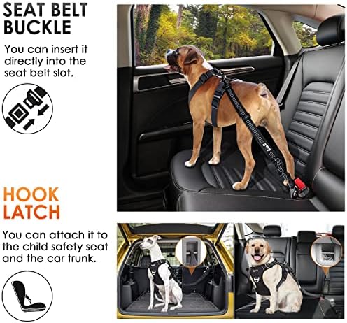𝗦𝗔𝗙𝗘𝗧𝗬 𝗔𝗡𝗗 𝗖𝗢𝗠𝗙𝗢𝗥𝗧 — Using our 2 in 1 design dog seat belt leash will keep your pet safely restrained in vehicle while you concentrate on driving, and the adjustable seat belt will allows your dog to sit, stand, lie down comfortably or reach to see out of the window but keep them from jumping around in the car.
